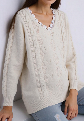 Kabelstickad tröja med vacker virkad spetskant runt V-ringningen. Mjuk, stretchig och feminin – perfekt att bära ensam eller under kavaj för en elegant look.