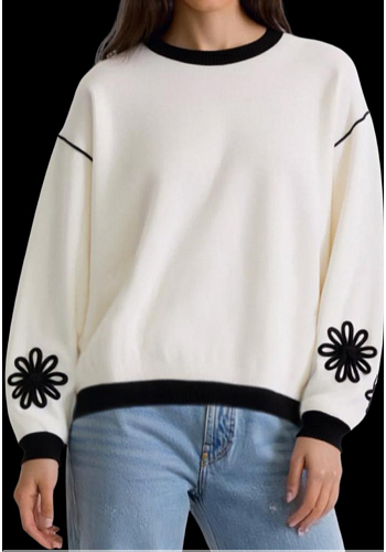Stilren och modern tröja med svart kontrastkant och dekorativa blommor på ärmarna, en snygg vardagsfavorit som funkar både till jeans och kjol!