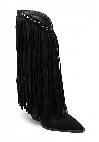 Svarta stövlar med långa fransar och dekorativ nitar i kanten. En riktig statement-sko som lyfter vilken outfit som helst, perfekt både till festival, vardag eller utekvällen!