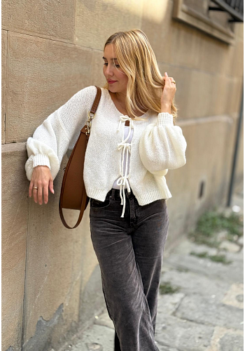 Charmig stickad cardigan med puffärm och dekorativa knytband framtill. Den kortare modellen och ballongärmarna ger ett feminint uttryck som passar perfekt till både klänning och höga jeans. En kundfavorit i neutrala och naturnära toner.