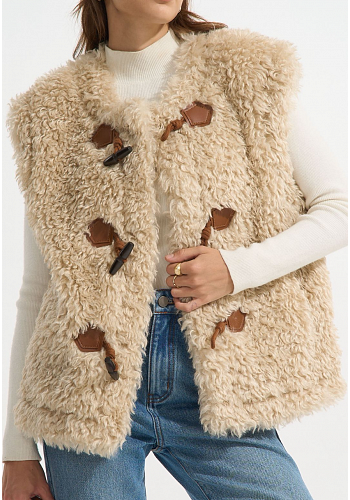 Snygg, mysig och trendig väst i fuskpäls med dekorativa träknappar, perfekt för höst & vinter. Lätt att styla över både stickat och jackor!
