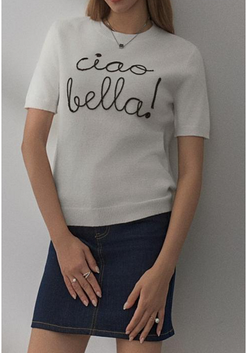 Topp med kort ärm och broderat tryck "Ciao Bella". Perfekt till jeans, kjol eller under en kavaj för en chic vardagslook.
