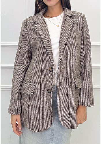 En stilsäker kavaj i fiskbensmönster med markerade ränder och dekorativa knappar. Perfekt både till jobbet och middagen – styla med denim, kjol eller dressade byxor för en komplett look.