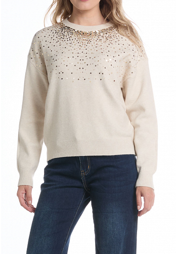 Mjuk tröja med rund hals och vackra paljettbroderier framtill som ger en elegant glittrande effekt. Perfekt för att addera lite festkänsla i vardagen.
