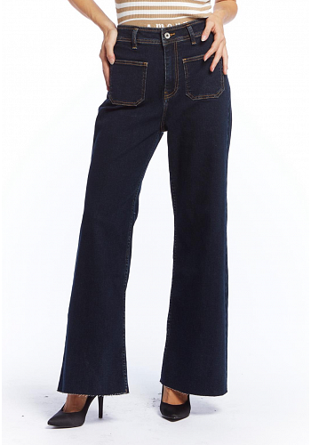 Trendiga jeans med hög midja, råkant nertill och framfickor som sticker ut – perfekt balans mellan struktur och stretch.
