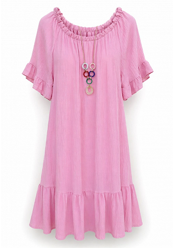 En feminin och lättburen klänning i mjuk viskos med dekorativ volang nertill och elastisk halsringning. Modellen levereras med ett matchande halsband som ger ett komplett och trendigt uttryck. Den luftiga passformen gör plagget perfekt för både varma sommardagar och lager-på-lager styling – ett säkert kort i butik.