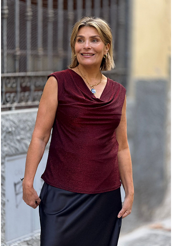 Festligt linne i populär modell med elegant vattenfallskrage och bredare axelband som ger en smickrande siluett. Det glittrande tyget lyfter varje outfit, perfekt för kvällsevent, julfester eller ett stilfullt nyårsfirande. Ett måste i butik inför högtiderna!