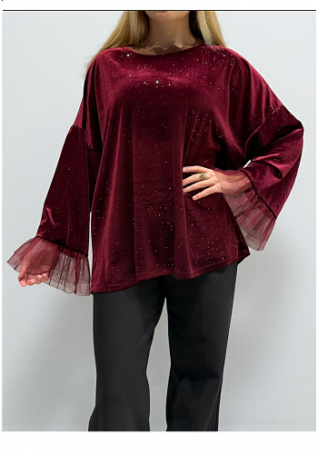 Festredo på ett ögonblick! Denna sammetsmjuk topp kombinerar komfort med elegans, och har vackert fall samt transparenta tyllvolanger vid ärmslut. De subtila glitterdetaljerna lyfter looken utan att ta över, en favorit för både butik och event.