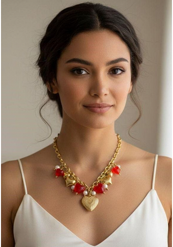 Kärleksfull statement-pjäs med hjärtformade hängen i rött och guld, pärldetaljer och ett dekorativt hjärtberlock i antik stil. Ett halsband som för tankarna till både romantik och vintage – perfekt till stickat, klänningar eller som kontrast till en enkel t-shirt.