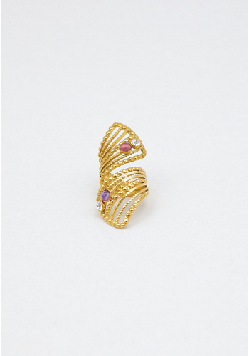 Stilren och modern ring med gnistrande stenar och eleganta gulddetaljer. Den justerbara designen ger en bekväm passform och gör ringen enkel att anpassa. En mångsidig accessoar som passar lika bra till vardag som till fest.
