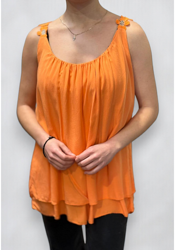 Linne i mjuk och följsam viskos med dekorativa blomdetaljer på axelbanden. En feminin och luftig modell som passar perfekt för sommarens sortiment.