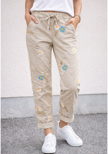 Vår bästsäljande “magiska byxa” med stretch och fantastisk passform. Mjuk och följsam kvalitet med resår och knyt i midjan samt vackra broderade blommor som ger en feminin och unik känsla. Perfekt att styla med sneakers och t-shirt för en avslappnad chic look.