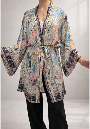 Elegant och luftig kimono i vackra mönster med knytband i midjan. Tillverkad i Indien – perfekt att bära över klänning, topp eller badkläder för en bohemisk sommarlook.
