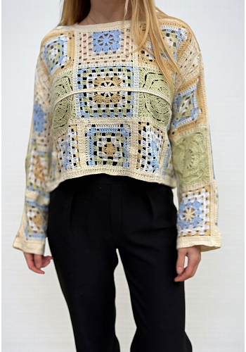 Charmig virkad topp i klassiskt mormorsrute-mönster med tydlig retroinspiration. Ett trendigt plagg som ger en bohemisk och somrig känsla, perfekt att bära både till jeans och kjol.