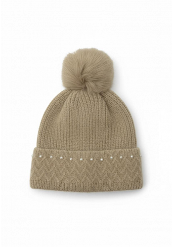 Mjuk och varm mössa fodrad på insidan, dekorerad med pärlor framtill och en fluffig pälsboll upptill – perfekt för kyliga höstdagar med en feminin touch.