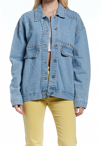 Trendigt oversized jeansjacka med dekorativa nitar som ger en tuff och modern look. Ett perfekt statementplagg som lyfter både vardags- och feststyling.