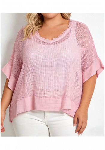 Finmaskad nät-tunika med v-ringning och dekorativ kant.