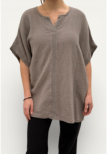 Luftig och bekväm oversize-modell med fin V-ringning och dekorativ detalj framtill.