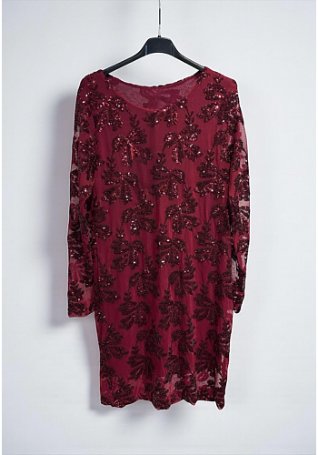 En glamorös klänning täckt i bladformade paljetter med transparenta ärmar och stretchig passform. Lätt vadderad insida för bekvämlighet och täckning. Ett perfekt val till nyår, fest eller andra glittriga tillfällen där du vill glänsa lite extra.