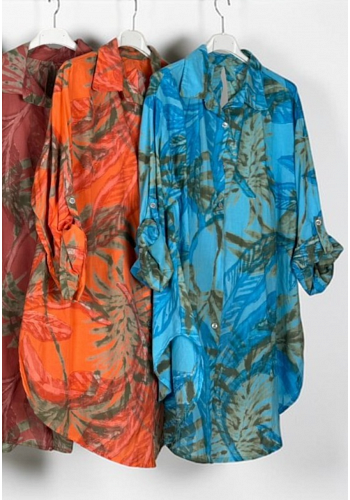 Luftig skjorta med palmbladsmönster och klassisk knappstängning framtill.