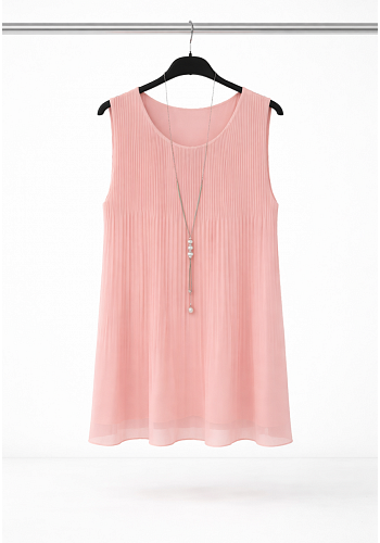 Ett elegant och lättburet plisserat linne som levereras med matchande halsband för en komplett look. Den luftiga chiffongen ger ett vackert fall medan underlinnet säkerställer komfort och täckning. Ett perfekt statementplagg för sommarens sortiment med hög efterfrågan.