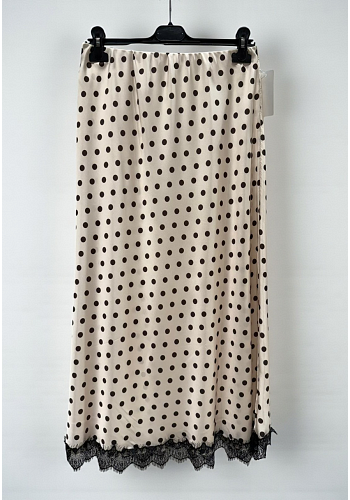 Elegant kjol i mjukt satintyg med klassiskt prickigt mönster och dekorativ spetskant nertill. Resåren i midjan ger en bekväm passform som gör den lika fin till en enkel t-shirt som till en dressad blus, en tidlös favorit med charmig twist.