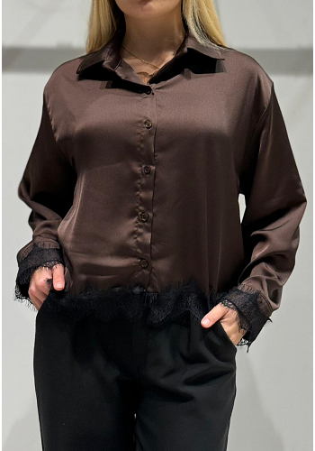 Elegant skjortblus i satinliknande material med vacker spetskant nedtill och vid ärmsluten. Denna modell kombinerar en klassisk siluett med feminina detaljer, perfekt både till kostymbyxan på kontoret och som stilfull topp till kvällens middagslook.