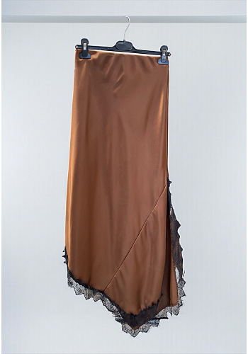 Asymmetrisk satinkjol med dekorativ spetskant – feminin, elegant och stretchig. Fungerar lika bra till vardags som till fest.