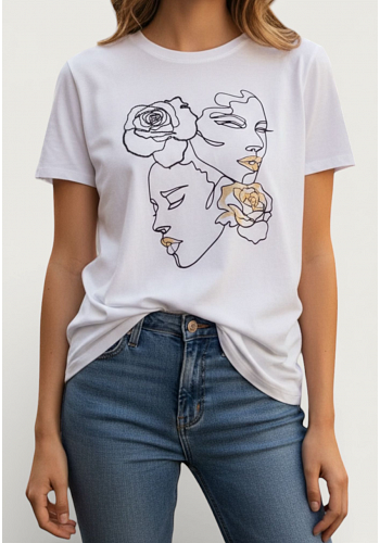 Trendigt motiv med abstrakta ansikten och rosdetaljer i guld som ger en exklusiv känsla. Mjuk och stretchig kvalitet med skön passform – perfekt till både jeans och kjol.