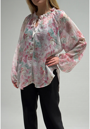 Underbart tunn och luftig blus med vackert blommönster och knytband vid halsringningen. En romantisk modell som passar lika fint till vardags som till sommarens festligheter.