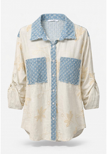 Snygg och unik skjorta med dekorativa denimdetaljer och broderade mönster. Avslappnad modell med krage och fickor – en stilren statementblus som passar perfekt till både jeans och byxor.