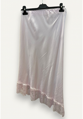 Snedskuren kjol i mjuk viskos- och sidenblandning med vacker lyster och fint fall. Dekorativ spetskant nedtill ger en feminin och exklusiv känsla – perfekt för säsongens sortiment.