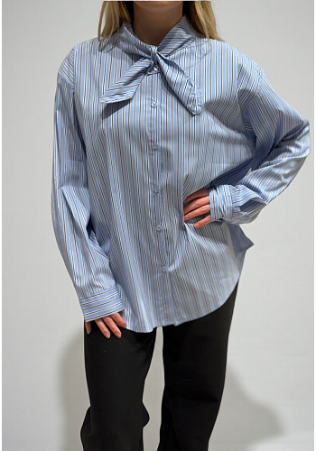 Klassisk randig skjortblus med modern twist och knytband i halsen som ger en stilfull helhet. En lättmatchad favorit som passar lika bra till jobbet som till vardags.