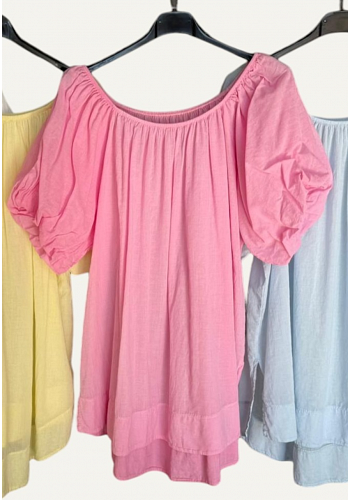 Söt och luftig sommarblus med fina puffärmar och resår runt ärmsluten som ger en mjuk och feminin silhuett. Något transparent kvalitet som gör den perfekt för varma dagar – lika fin till jeans som kjol.