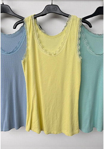 Mjukt ribbat linne med stretch och fin spetskant runt urringning och ärmhål. En mångsidig topp som fungerar lika bra ensam som i lager – bekväm, feminin och lätt att matcha.
