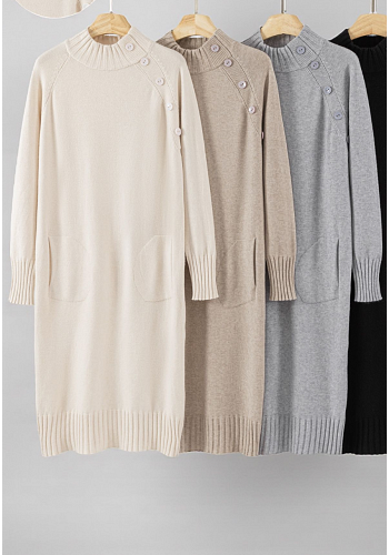 Elegant stickad klänning med dekorativa knappar längs axeln och fickor framtill. Mjuk, stretchig och varm – ett perfekt val för höst och vinter.
