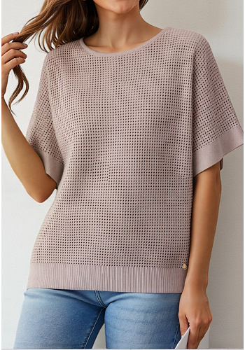 Modern stickad topp i luftig struktur med kort ärm och rund halsringning. Designad med breda ärmslut och ribbad fåll för ett välbalanserat och stilrent intryck. Dekorativ metallbricka med strassdetalj framtill ger ett exklusivt inslag. Ett mångsidigt plagg som fungerar lika bra på kontoret som i vardagen.