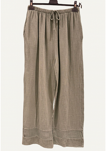 Härlig vid byxa i trendig bäckebölja med resår och dragsko i midjan samt praktiska sidofickor. Snygg detalj i benslutet och ett luftigt fall – perfekt för vår och sommar.