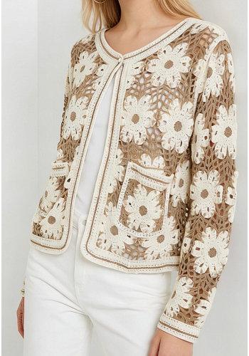 En trendig virkad kofta med dekorativa blommönster som ger ett exklusivt och hantverksinspirerat uttryck. Den öppna designen med knappdetalj framtill och praktiska fickor gör plagget både stilrent och funktionellt. Perfekt som statement-plagg i sommarens kollektioner.