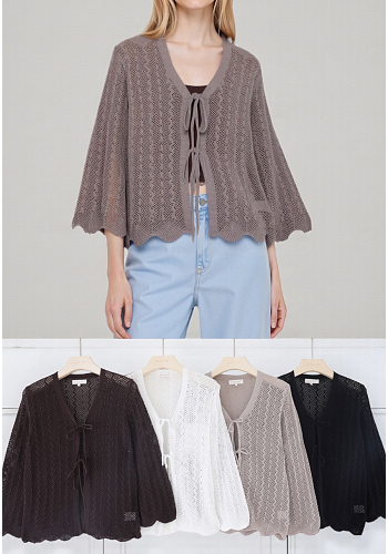 Lätt och luftig cardigan i virkad design med vackert hålmönster och dekorativa vågiga kanter. Modellen har två knytband framtill som ger en feminin och bohemisk känsla. Perfekt som ett somrigt lager över linne eller klänning.