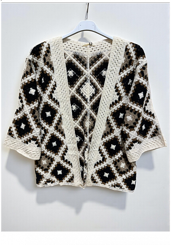 Färgglad och trendig virkad kofta i klassiskt mormorsrutemönster. Ett perfekt lager-på-lager-plagg som ger karaktär och charm till outfiten, lika fint till vardags som till festival och lediga vår- och sommardagar.
