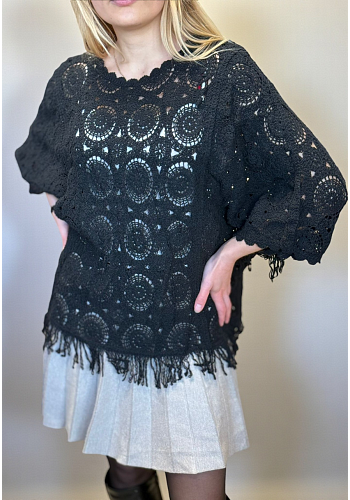 Luftig och vackert virkad topp med ponchokänsla och dekorativt mönster. Fransad kant nertill ger en bohemisk touch. Perfekt att bära över linne eller bikini – ett självklart val för vårens och sommarens garderob.