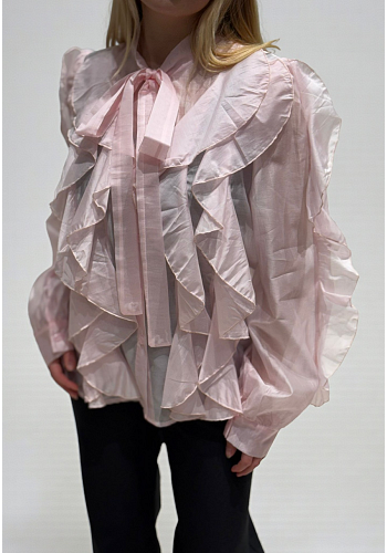 Elegant och feminin blus i lätt glansigt tyg med volangdetaljer och knyt i halsen som skapar en modern slips-effekt. En stilfull modell som fungerar lika fint till vardag som till fest.