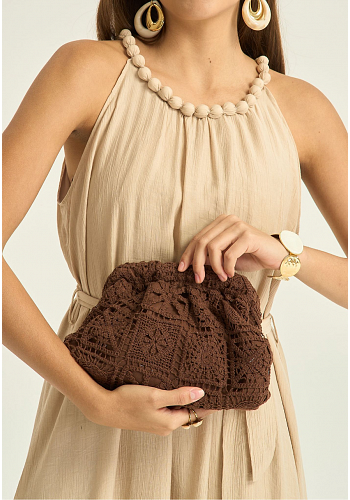Trendig virkad clutch med dekorativ struktur och guldfärgad kedjerem. Fodrad inuti och rymmer det viktigaste – mobil, kort och läppglans.